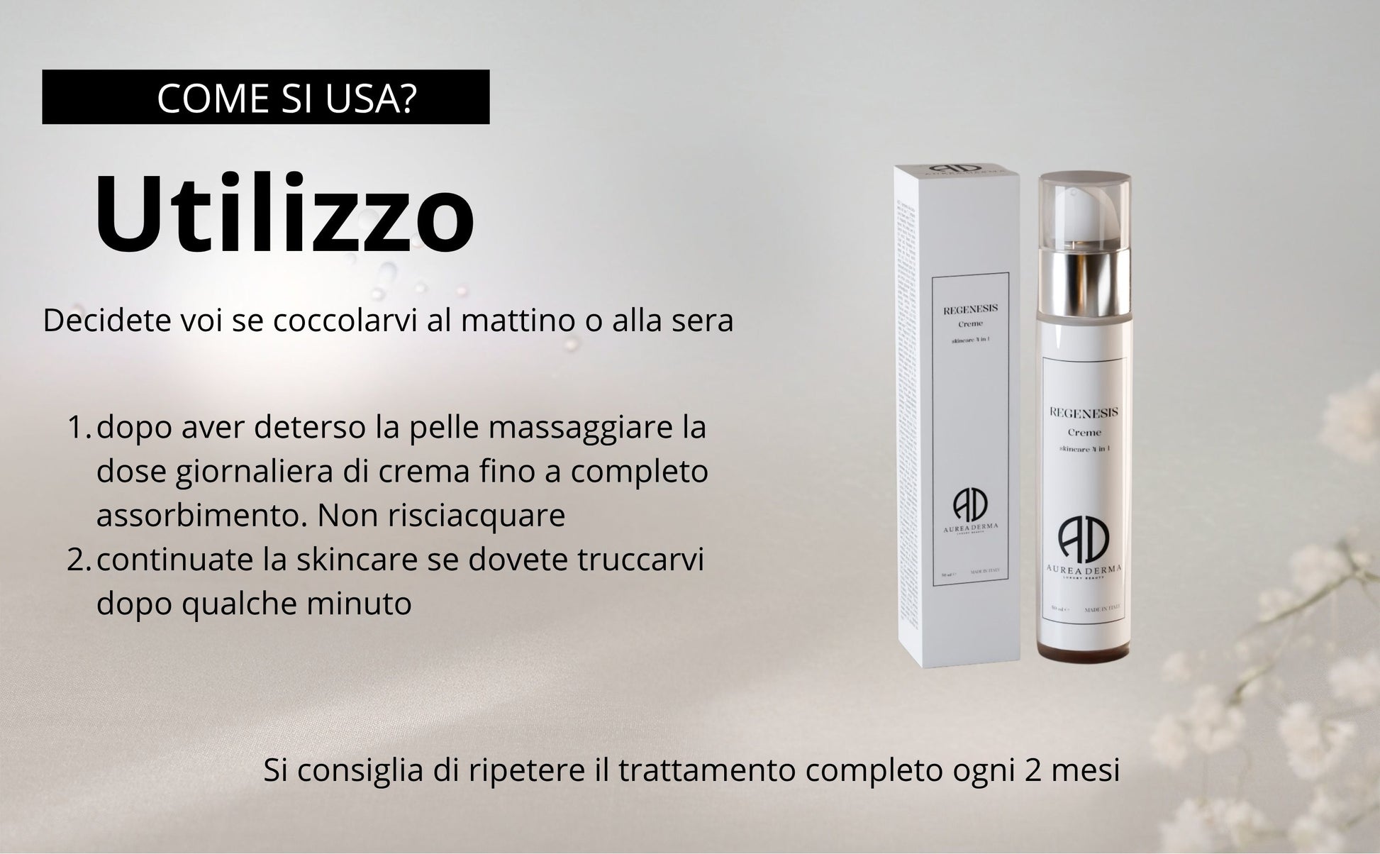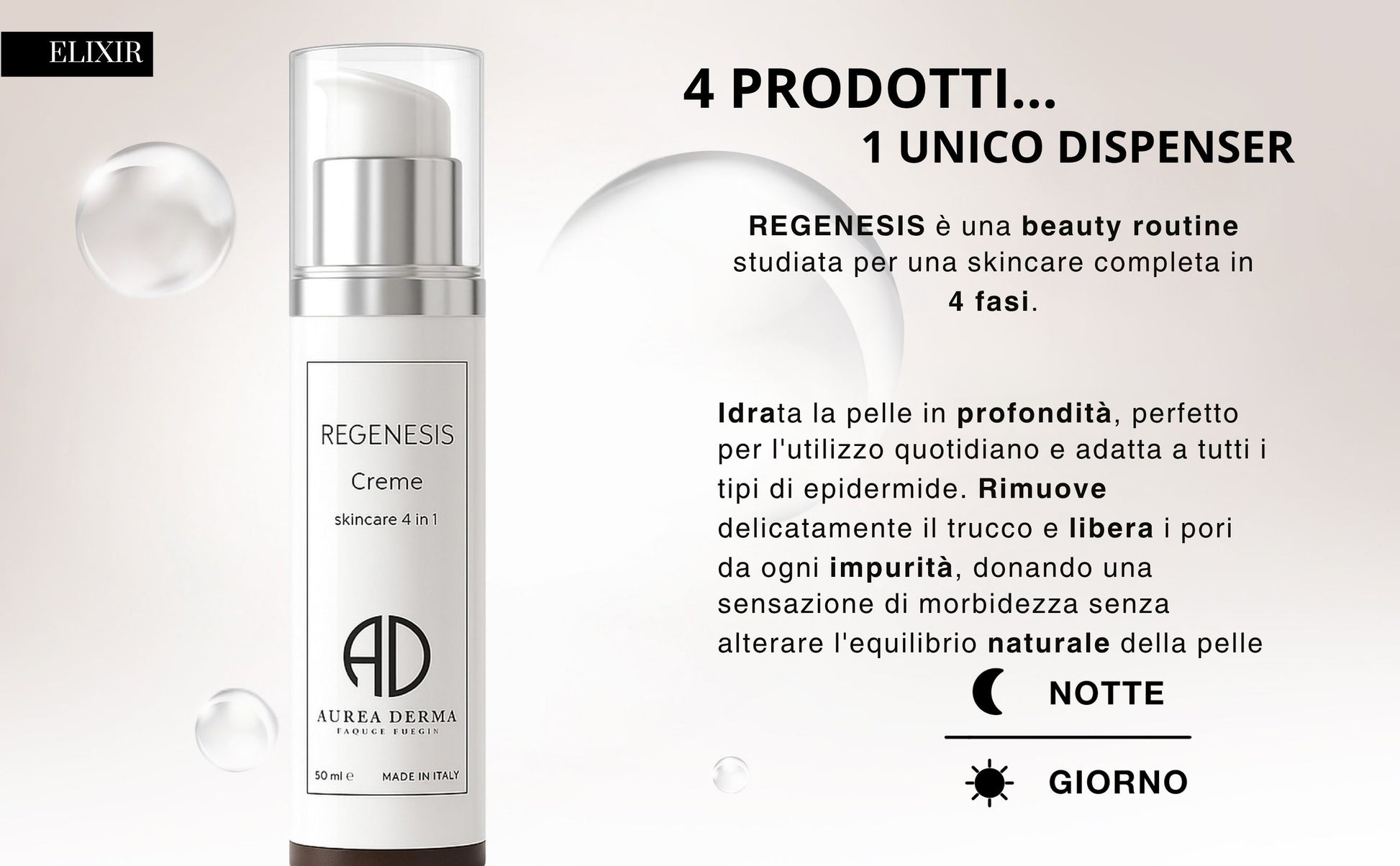 Regenesis sostituisce 4 prodotti (esfoliante, siero, crema lifting, crema idratante) in un unico gesto quotidiano.